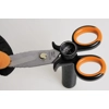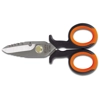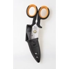 Forbici per elettricisti con profili a fresa graduata in acciaio inossidabile, con custodia. Novità: Patent pending. Custodia snodata agganciabile alla cintura. Impugnatura bimateriale. Perno antiallentamento.