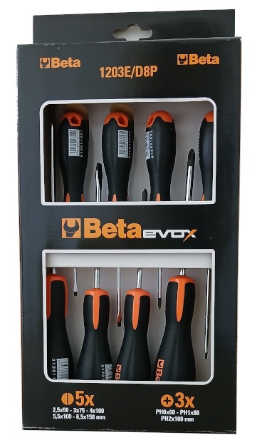 Contenuto confezione n.5 giravite lama piatta, art.1201E, 2,5x50 - 3x75 - 4x100 - 5,5x100 - 6,5x150 mm.
