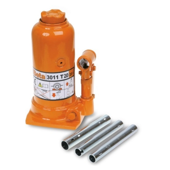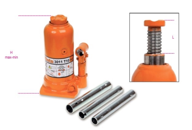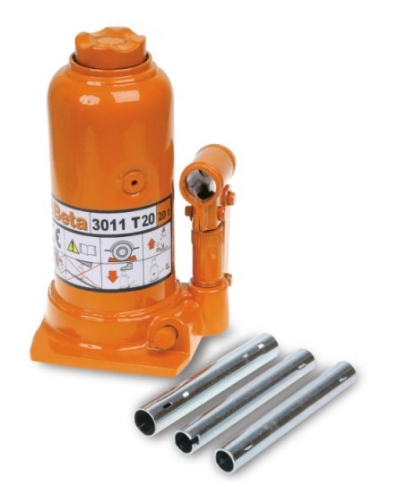 Rif. Beta 030110050. Articolo Beta 3011T 5. Sollevatore idraulico a bottiglia. Sollevatore idraulico Beta, costruioi con acciaio saldato di alta qualità. Progettato per sollevare carichi elevati con ingombro minimo, offre massima versatilità grazie alla leva in 3 segmenti, ideale anche in spazi ristretti.Valvola di sicurezza per sovraccarico che assicura protezione totale durante l'uso, mentre la prolunga del pistone regolabile in altezza garantisce un utilizzo flessibile.
