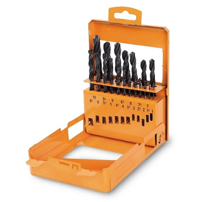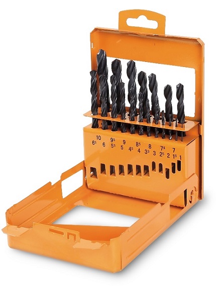 Rif. Beta 004100419. Articolo Beta 410/SP19. Serie di 19 punte elicoidali cilindriche, in acciaio HSS, rullate. Serie corta. Finitura brunita. R≤650 N/mm² HV ̴ 750÷820
