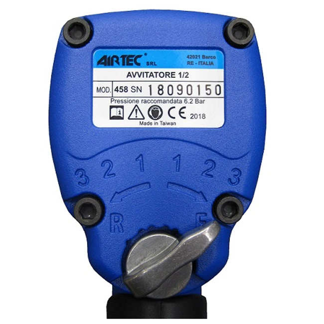 Avvitatore ad impulsi con attacco da 1/2" - Mod. 458 - Cod. 12102087. Avvitatore ad impulsi 1/2", compatto, 104 mm. Molto potente, con sistema a singolo martello Jumbo.Scarico dell'aria nell'impugnatura e regolatore a 3 posizioni per senso di rotazione. Dotato di foro per ingrassaggio nell'albero.