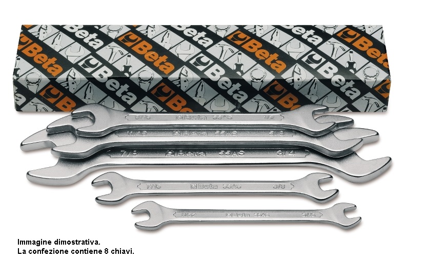 Rif. Beta 000550296. Articolo Beta 55AS/8. Serie di 8 chiavi a forchetta doppie (art. 55AS).Misure in pollici.