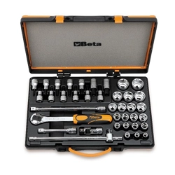 Serie di 17 chiavi a bussola esagonali e 5 accessori in termoformato morbido. In cassetta di lamiera. Assortimento composto da: n. 920A: chiavi a bussola esagonali 1/2" 10-11-12-13-14-15-16-17-18-19-20-21-22-24-27-30-32 mm. n. 920/21: prolunga - 1/2" 125 mm. n. 920/22: prolunga - 1/2" 255 mm. n. 920/25: snodo 1/2" n. 920/42: quadro maschio 1/2" con spina scorrevole n. 920/55: cricchetto reversibile 1/2"
