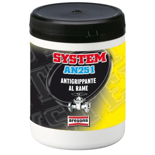 Antigrippante System AN251 500 g. - Cosice AX4251.Prodotto antigrippante per ferro, acciaio Inox, ghisa, plastica, titanio, rame e ottone. Lubrificante speciale contenente rame. Le particelle di rame formano un rivestimento protettivo che impedisce la fusione delle superfici metalliche sotto forte pressione. Deve essere applicato sulle parti meccaniche prima del loro montaggio per lubrificare, prevenire il grippaggio, facilitare lo smontaggio. Protegge le filettature dalla corrosione, dall'usura, deformazione, rottura e dal grippaggio. Ideale per bulloni, flange, giunti di motori Diesel e di pompe per prodotti chimici, per bulloni marini e di autoveicoli, bulloni e giunti di pompe per olio ad alta temperatura, bulloni e cavi per costruzione, pompe di raffineria e flange di tubi. Inerte alla maggior parte dei gas. Resiste al lavaggio ed all'acqua salina, è inerte alla maggior parte dei gas, resiste a temperature fino a + 1000 ÷ 1100°C ca. e ad estreme pressioni. Consente di riutilizzare le parti meccaniche trattate.Semplifica le operazioni di manutenzione e riduce tempi di lavoro e costi.