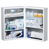 Armadietto a muro per primo soccorso MED F10 - art.111038. In metallo. Due ante portanti con chiusura a chiave. Dotato di 5 vani interni. Per aziende del gruppo A e gruppo B. Contenuto come da All.1 maggiorato a norma D.M 388 del 15/07/03 - D.Lgs. 81/08: 1 copia Decreto Min 388 del 15.07.2003;5 Paia guanti sterili;1 Mascherina con visiera paraschizzi;3 soluzione fisiologico 500 ml CE;2 Disinfettante 500 ml IODOPOVIDONE al 10% iodio PMC;10 buste garza compressa sterile 10x10 cm sterile;2 Buste garza compressa sterile 18x40 cm;2 Telo sterile 40x60 cm DIN 13152-BR;1 Confezione di cotone idrofilo;2 Pinze sterili;1 Astuccio benda tubolare elastica;2 Rocchetti cerotto adesivo m 5x2,5 cm;2 PLASTOSAN 20 cerotti assortiti;1 Paio di forbici tagliabendaggi 14,5 cm DIN 58279;3 Lacci emostatici;2 ICE PACK ghiaccio stantaneo monouso;2 Sacchetti per rifiuti sanitari;1 Termometro clinico digitale CE;1 Sfigmomanometro PERSONAL con fonendoscopio;4 Benda di garza da m 3,5x10 cm;1 Astuccio PIC 3 contenente: 3 sapone liquido, 3 salviette disinfettanti, 2 salviette ammoniaca;1 PINOCCHIO+VENTO kit completo;1 Coperta Isotermica oro/arg. 160x210 cm;1 Telo triangolare in TNT cm 96x96x136;2 Preparato 3,5 g GEL PER USTIONI sterile;2 Benda elastica m 4x6 cm DIN 61634;1 Tampobenda sterile mm 80x100 DIN 13151 M.