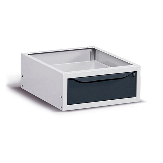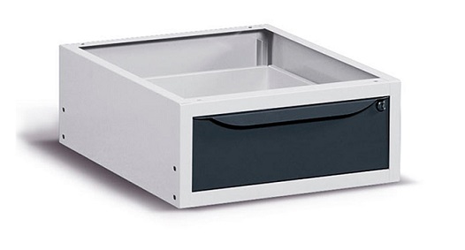 Realizzato in lamiera verniciata. Facilmente installabile nella parte inferiore del banco per poter organizzare le diverse attrezzature per il lavoro. Composto da n.1 cassetto (H utile interna 137mm.). Con serratura a chiave. Può essere utilizzato sia nei banchi che nei carrelli. Se impiegato in carrelli Clever Large, può essere installato sia frontalmente, sul lato della maniglia, che lateralmente, se applicato al piano in legno.Portata cassetto 25 Kg. Disponibile anche nella versione blu RAL5012 (FBG03S50C000104)