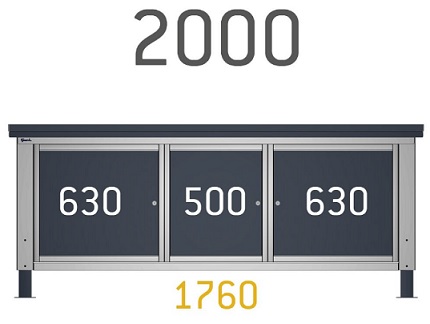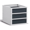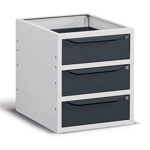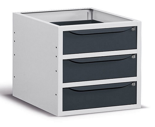 Realizzato in lamiera verniciata. Facilmente installabile nella parte inferiore del banco per poter organizzare le diverse attrezzature per il lavoro. Composto da n.3 cassetti (H utile interna 137mm.). Con serratura a chiave.Portata per ogni cassetto 25 Kg. Disponibile anche nella versione blu RAL5012 (FBG03S63C000204)
