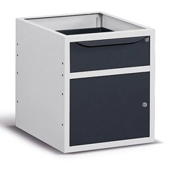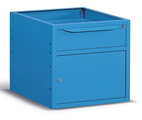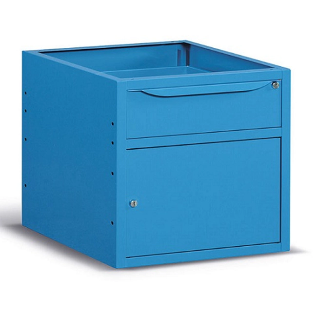 Realizzato in lamiera verniciata. Facilmente installabile nella parte inferiore del banco per poter organizzare le diverse attrezzature per il lavoro. Composto da:n.1 cassetto (H utile interna 137mm.), con serratura a chiave.Portata cassetto 25 Kg. n.1 porta H 310 mm., con serratura a chiave.SENZA FONDO DI CHIUSURA (da utilizzare solo negli armadi con porta quando è presente il semipiano).Disponibile anche nella versione grigio RAL7035+RAL7016 (FBG03S63C0004PD)