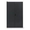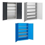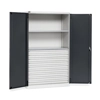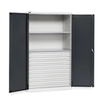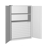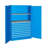 Solida struttura in lamiera di metallo. Porte a battente, dotate di serratura a chiave. Profili a cremagliera per l’inserimento di piani opzionali. n.9 cassetti ad estrazione telescopica H85 mm. (frontalino H100mm.). n.2 piani fessurati regolabili in altezza. Due intagli sulla lamiera, nel retro, permettono all’occorrenza di creare dei fori passacavo.