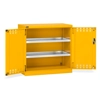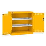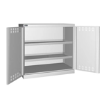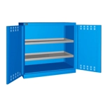Per lo stoccaggio di prodotti inquinanti l'ambiente come vernici, solventi, fitofarmaci e altri prodotti chimici. Solida struttura in lamiera di metallo. Porte a battente fessurate, dotate di serratura a chiave. Profili a cremagliera per l’inserimento di piani opzionali. n.2 vasche stagne interne raccolta liquidi, regolabili in altezza. Le vasche sono idonee a liquidi infiammabili delle categorie GHS 1 - 3 e liquidi inquinanti per le acque delle categorie GHS 1 - 4. Capacità massima delle vasche 19 litri. Due intagli sulla lamiera, nel retro, permettono all’occorrenza di creare dei fori passacavo.