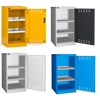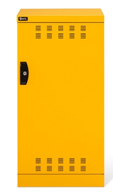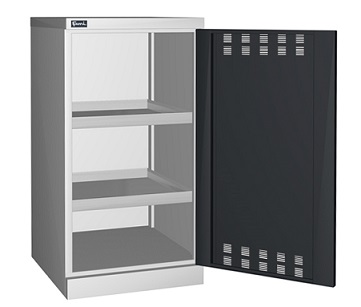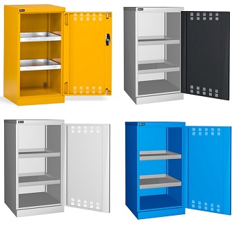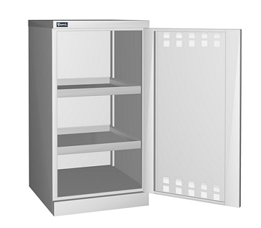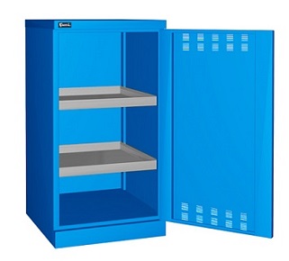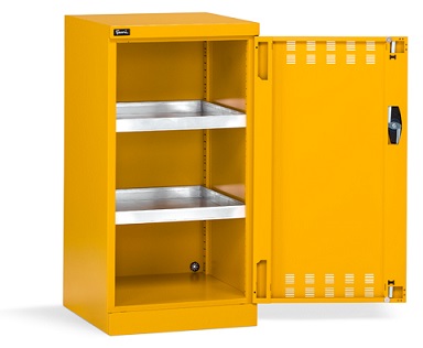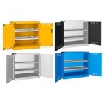 Per lo stoccaggio di prodotti inquinanti l'ambiente come vernici, solventi, fitofarmaci e altri prodotti chimici. Solida struttura in lamiera di metallo. Porta a battente fessurata, dotata di serratura a chiave, con cerniera destra. Profili a cremagliera per l’inserimento di piani opzionali. n.2 vasche stagne interne raccolta liquidi, regolabili in altezza. Le vasche sono idonee a liquidi infiammabili delle categorie GHS 1 - 3 e liquidi inquinanti per le acque delle categorie GHS 1 - 4. Capacità massima delle vasche 9 litri. Due intagli sulla lamiera, nel retro, permettono all’occorrenza di creare dei fori passacavo.