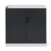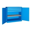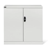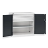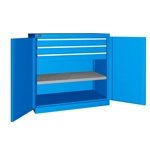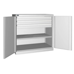 Solida struttura in lamiera di metallo. Porte a battente, dotate di serratura a chiave. Profili a cremagliera per l’inserimento di piani opzionali. n.3 cassetti ad estrazione semplice H85 mm. (frontalino H100mm.). n.1 piano fessurato regolabile in altezza. Due intagli sulla lamiera, nel retro, permettono all’occorrenza di creare dei fori passacavo.