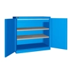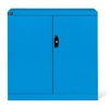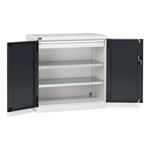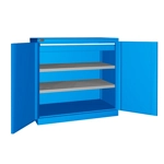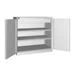 Solida struttura in lamiera di metallo. Porte a battente, dotate di serratura a chiave. Profili a cremagliera per l’inserimento di piani opzionali. n.1 cassetto ad estrazione semplice H85 mm. (frontalino H100mm.)n.2 piani fessurati regolabili in altezza. Due intagli sulla lamiera, nel retro, permettono all’occorrenza di creare dei fori passacavo.