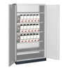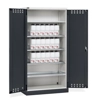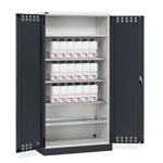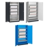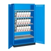 BREVETTATO. Per lo stoccaggio di sostanze pericolose. Solida struttura in lamiera di metallo. Porte a battente fessurate, dotate di serratura a chiave. Profili a cremagliera per l’inserimento di piani opzionali. n.1 piano fessurato regolabile in altezza. n.3 piani fessurati con 2 separatori e 6 tanichen.1 vasca interna tenuta stagna completa di ganci Capacità massima della vasca 19 litrin.1 vasca esterna a tenuta stagna raccolta liquidi Capacità massima della vasca 59 litri Le vasche sono idonee a liquidi infiammabili delle categorie GHS 1 - 3 e liquidi inquinanti per le acque delle categorie GHS 1 - 4. Due intagli sulla lamiera, nel retro, permettono all’occorrenza di creare dei fori passacavo.
