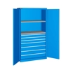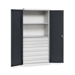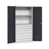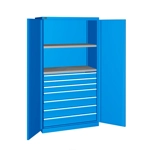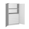 Solida struttura in lamiera verniciata. Idoneo a diverse necessità di immagazzinaggio e può essere impiegato in diversi ambiti: dall'officina, al magazzino, al laboratorio fino all'ufficio. n.2 piani fessurati regolabili in altezza. Cassetti per massimizzare l'organizzazione e la suddivisione dello spazio interno in base al materiale da stoccare: n.3 cassetti ad estrazione semplicen.4 cassetti ad estrazione telescopica Porte a battente, dotate di chiusura a chiave. Profili a cremagliera per l’inserimento di piani opzionali. Completo di: n.1 kit 2 piani fessurati n.3 cassetti ad estrazione semplice n.4 cassetti ad estrazione telescopica Due intagli sulla lamiera, nel retro, permettono all'occorrenza di creare dei fori passacavo.