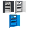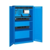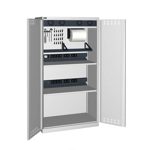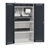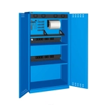 BREVETTATO. Solida struttura in lamiera verniciata. Le ante a battente fessurate, le ventole e i piani-pannelli forati lo rendono un perfetto incontro tra un armadio portautensili ed un armadio per la ricarica. Presenta canalette elettriche dotate di multiprese a 2 o a 4 scomparti e un interruttore magnetotermico differenziale per la ricarica di utensili elettrici e piani-pannelli forati con accessori Iron Team e ganci Unipok per l'organizzazione di attrezzi e componenti. Parte superiore con griglia porta ventole completa di due ventole per favorire il ricircolo dell'aria ed evitare il surriscaldamento dell'interno dell'armadio. Porte a battente, fessurate, dotate di serratura a cilindro. Le fessure favoriscono la circolazione dell'aria all'interno dell'armadio. Profili a cremagliera per l’inserimento di piani opzionali. Completo di: n.2 kit 2 piani-pannelli forati n.2 canalette elettriche per multiprese n.1 griglia ventole per armadi n.2 ventole 230V senza griglia con spina Schuko n.3 multiprese Schuko a 4 scomparti n.4 multiprese Schuko a 2 scomparti n.1 magnetotermico differenziale n.1 cavo di collegamento Wieland con spine in/out n.2 cavi di collegamento Wieland Schuko/FR n.2 mensole grandi reversibili n.1 kit porta rotolo con carta Ø 240/300 mm. n.1 confezione da 30 ganci Unipok