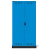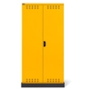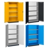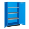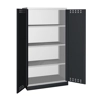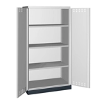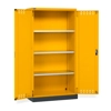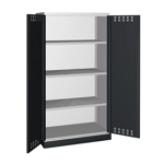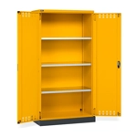 BREVETTATO. Solida struttura in lamiera di metallo. Porte a battente fessurate, dotate di serratura a chiave. Profili a cremagliera per l’inserimento di piani opzionali. n.3 piani fessurati, regolabili in altezza n.1 vasca stagna esterna raccolta liquidi La vasca è idonea a liquidi infiammabili delle categorie GHS 1 - 3 e liquidi inquinanti per le acque delle categorie GHS 1 - 4. Capacità massima della vasca 59 litri. Due intagli sulla lamiera, nel retro, permettono all’occorrenza di creare dei fori passacavo.