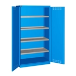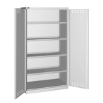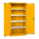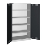 Solida struttura in lamiera di metallo. Porte a battente fessurate, dotate di serratura a chiave. Profili a cremagliera per l’inserimento di piani opzionali. n.4 vasche interne tenuta stagna complete di ganci, regolabili in altezza. Le vasche sono idonee a liquidi infiammabili delle categorie GHS 1 - 3 e liquidi inquinanti per le acque delle categorie GHS 1 - 4. Capacità massima delle vasche 19 litri. Due intagli sulla lamiera, nel retro, permettono all’occorrenza di creare dei fori passacavo.