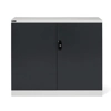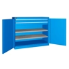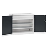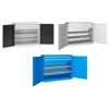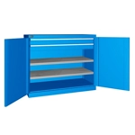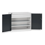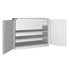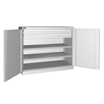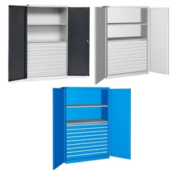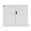 Solida struttura in lamiera di metallo. Porte a battente, dotate di serratura a chiave. Profili a cremagliera per l’inserimento di piani opzionali. n.2 cassetti ad estrazione telescopica H85 mm. (frontalino H100mm.). n.2 piani fessurati regolabili in altezza. Due intagli sulla lamiera, nel retro, permettono all’occorrenza di creare dei fori passacavo.