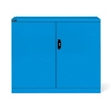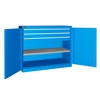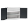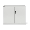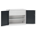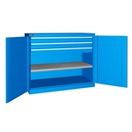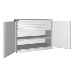 Solida struttura in lamiera di metallo. Porte a battente, dotate di serratura a chiave. Profili a cremagliera per l’inserimento di piani opzionali. n.3 cassetti ad estrazione telescopica H85 mm. (frontalino H100mm.). n.1 piano fessurato regolabile in altezza. Due intagli sulla lamiera, nel retro, permettono all’occorrenza di creare dei fori passacavo.