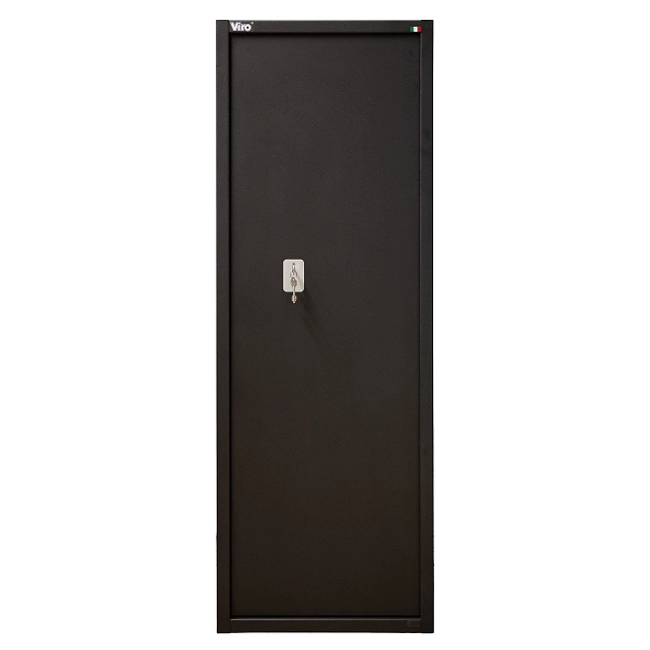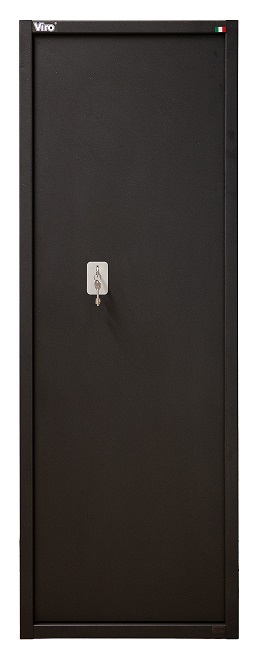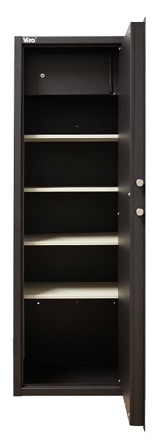 CARATTERISTICHE TECNICHE4 RIPIANI Struttura in acciaio di spessore 2 mm. verniciato a polveri di colore grigio antracite metallizzato e fori passanti sulla parete posteriore (n.3 da 8 mm. per il fissaggio a muro e n.2 da 6 mm, per il fissaggio dell'eventuale paratia (per l'eventuale trasformazione nel modello modulare portaoggetti)Sportello in acciaio di spessore 3 mm. verniciato a polveri di colore grigio antracite metallizzato, a battuta su tre lati e lato cerniera sottosquadro contro lo strappoSerratura a doppia mappa a 2 mandate, 3 punti di chiusura e 6 gorges;Copertura del meccanismo di chiusura in acciaio di spessore 2 mm. verniciato a polveri di colore grigio antracite metallizzatoChiave a doppia mappa in ottone nichelato e logo Viro art. 1.079 con doppia estrazione, n°2 chiavi in dotazionen°4 catenacci in acciaio nichelato, rotanti (antitaglio), su tre lati Ø24 mm (2 in orizzontale +1 in alto +1 in basso);Kit ripiani composto da due sostegni laterali e 4 ripiani in acciaio di spessore 1 mm. verniciati a polveri di colore grigio RAL 7032 bucciato. I ripiani hanno una portata fino a 15 Kg. ciascuno e sono posizionabili a scelta dell'utente.La distanza minima tra due ripiani è di circa 11,5 cm. Le dimensioni dei ripiani 51x29 cm. sono idonee a riporre anche pc portatili e tabulati.Il montaggio dei ripiani, a cura del cliente, può essere eseguito facilmente seguendo le istruzioni riportate nella nota di installazione in dotazione.Tesoretto portamunizioni/portaoggetti dotato di serratura di chiusura in lega di zama cromata a 5 lamelle fornita con n°2 chiavi in ottone nichelato e medaglia plastificata art. 1.046.A. N.B.: la cerniera del tesoretto è interna. I RIPIANI SONO ORDINABILI ANCHE COME RICAMBI ARTICOLO 1.4430.0448