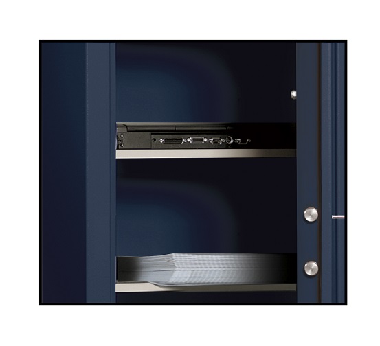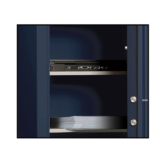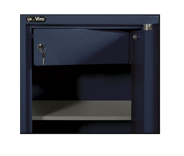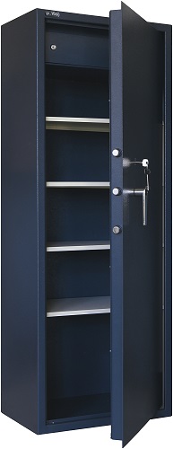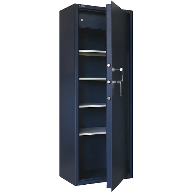 Codice Viro 4493.TR. Armadio portadocumenti meccanico con chiave a doppia mappa. L'armadio 4493.TR ha struttura e dimensioni idonee a conservare al sicuro sotto chiave: tabulati, raccoglitori, dischetti e pc portatili. CaratteristicheCassa: in acciaio di spessore 2 mm. Angoli smussati antiabrasione. 4 fori di fissaggio Ø 8 mm. aperti sulla parete posteriore, per l'ancoraggio con tasselli a muro (forniti in dotazione). Sportello: in acciaio di spessore 3 mm., a battuta su tre lati, con lato cerniere protetto contro lo strappo. Copertura in acciaio della serratura, di spessore 1 mm.Cerniere: in acciaio Ø 18 mm., fissate con perni in acciaio Ø 8 mm. Catenacci: rotanti antitaglio in acciaio nichelato: 3 orizzontali Ø 22 mm. e 2 verticali Ø 22 mm.Maniglia: maniglia per il movimento dei catenacci in lega zama con finitura cromata lucida.Chiavi: in zama nichelata, a doppia mappa, 2 in dotazione (art.1070). Tesoretto portamunizioni/portaoggetti dotato di serratura. Meccanismo:-chiave estraibile solo a sportello chiuso; -tramite la chiave è possibile sbloccare la rotazione della maniglia consentendo il movimento dei catenacci;Ripiani: 4 ripiani con portata fino a 15 Kg. ciascuno, posizionabili a scelta dell'utente, con dimensioni idonee a riporre anche pc portatili e tabulati. Dimensioni indicative dei ripiani 51x29x15 cm. (LxPxH)Portata massima di ciascun ripiano 15 Kg.Confezione: scatola individuale.I RIPIANI SONO ORDINABILI ANCHE COME RICAMBI ARTICOLO 1.4430.0448
