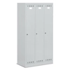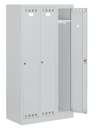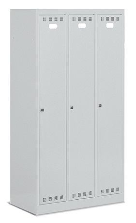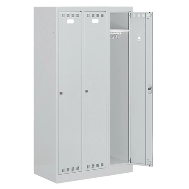 Realizzato in lamiera verniciata. Adatto per diversi ambienti: aziendali, sanitari, sportivi, scolastici. n.3 scomparti con piano regolabile in altezza nella parte superiore, con possibilità di inserimento di borse, zaini, caschi. Porte a battente, dotate di un porta etichetta per l’identificazione personale. Porte con fessure per favorire la circolazione dell’aria. Porte con chiusura a cilindro con chiave. Piedini e tetto inclinato acquistabili a parte.
