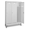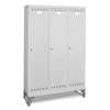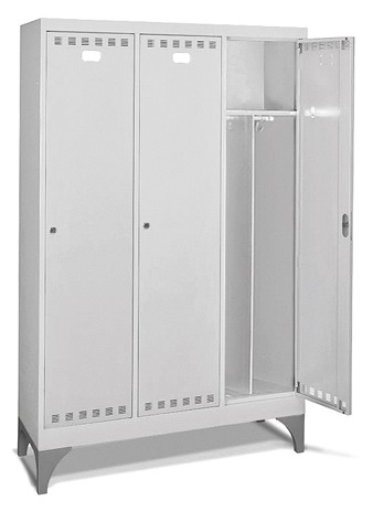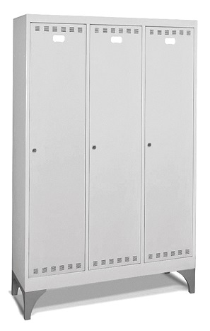 Realizzato in lamiera di acciaio. Verniciatura in elettroforesi. Adatto per diversi ambienti: aziendali, sanitari, sportivi, scolastici. n.3 scomparti con divisorio sporco/pulito. Parte superiore con piano zincato che crea un vano per inserimento di borse, zaini, caschi. Porte a battente, dotate di un porta etichetta per l’identificazione personale. Porte con fessure per favorire la circolazione dell’aria. Porte con chiusura a cilindro con chiave. Piedini in polipropilene H 200 mm.