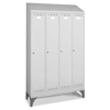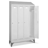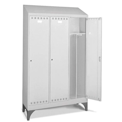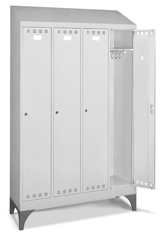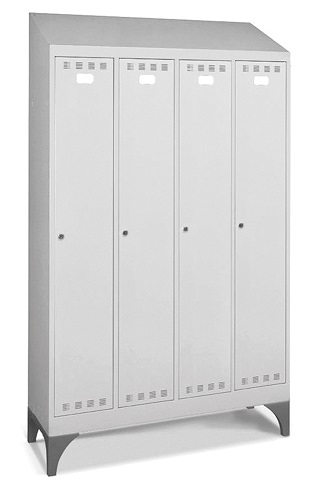 Realizzato in lamiera di acciaio. Verniciatura in elettroforesi. Adatto per diversi ambienti: aziendali, sanitari, sportivi, scolastici. n.4 scomparti a tutta lunghezza con piano con barra appendiabiti. Porte a battente, dotate di un porta etichetta per l’identificazione personale. Porte con fessure per favorire la circolazione dell’aria. Porte con chiusura a cilindro con chiave. Tetto inclinato. Piedini in polipropilene H 200 mm.