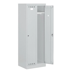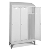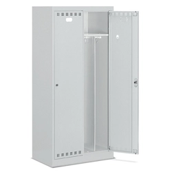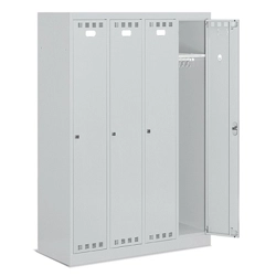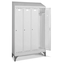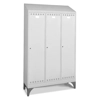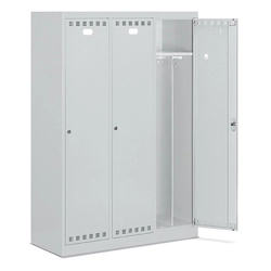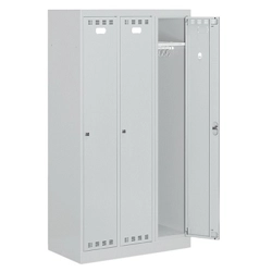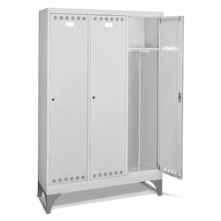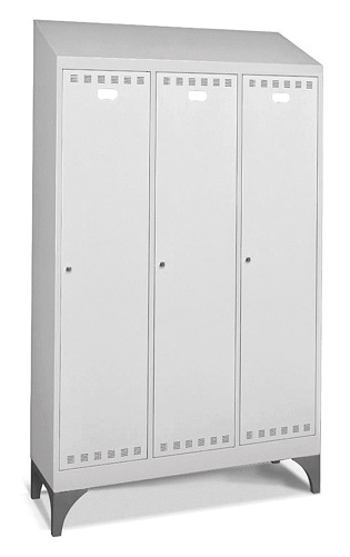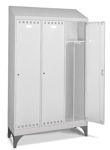 Realizzato in lamiera di acciaio. Verniciatura in elettroforesi. Adatto per diversi ambienti: aziendali, sanitari, sportivi, scolastici. n.3 scomparti con divisorio sporco/pulito. Parte superiore con piano zincato che crea un vano per inserimento di borse, zaini, caschi. Porte a battente, dotate di un porta etichetta per l’identificazione personale. Porte con fessure per favorire la circolazione dell’aria. Porte con chiusura a cilindro con chiave. Tetto inclinato. Piedini in polipropilene H 200 mm.