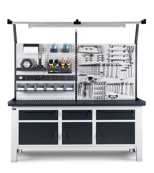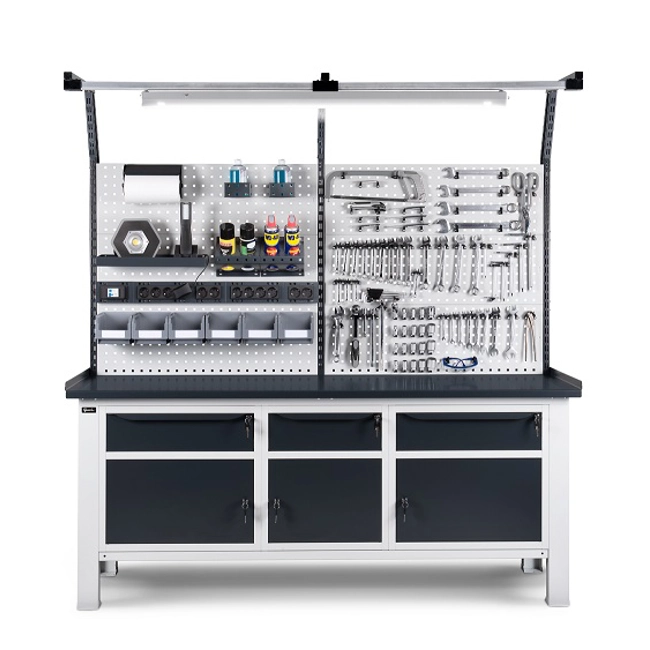 BREVETTATO. Banco da lavoro portautensili Work con 3 cassetti e 3 ante, piano in acciaio, pannelli portautensili Work Look e molti accessori. Si tratta di una postazione di lavoro che contiene tutto il necessario per far fronte alle diverse lavorazioni da effettuare durante il lavoro quotidiano. Ganci Unipok ed accessori Iron Team consentono di organizzare al meglio gli spazi sulla parete forata, mentre le multiprese consentono di disporre di una fonte di energia per la ricarica e l'utilizzo di utensili elettrici. Il binario ospita anche una lampada doppia LED per aumentare la visibilità sul piano di lavoro.Completo di: n.2 elementi con 4 cassetti e porta parziale L 629 mm. n.1 elemento con 1 cassetto e porta parziale L 500 mm. Piano in acciaio spessore 3 mm., con tre bordini rialzati.n.1 kit 3 montanti biasolati per banchi n.2 kit 3 pannelli forati/mensole con 2 bordi fermacasse n.1 kit 3 supporti inclinati con 2 binari base n.1 lampada IRON TEAM doppia n.2 barre aggancio contenitori con 3 contenitori Picking Box mis.2 n.1 supporto per interruttore magnetotermico n.2 supporti multipresa a 2 scomparti n.2 supporti multipresa a 4 scomparti n.1 magnetotermico differenziale n.2 multiprese Schuko 4 scomparti n.2 multiprese Schuko 2 scomparti n.1 cavo di collegamento Wieland Schuko/FR n.1 mensola portaoggetti reversibile n.2 porta bombolette inclinati a 2 posti n.1 kit porta rotolo con carta diam.130 mm. n.2 porta flaconi igienizzanti reversibili n.6 confezioni da 30 ganci Unipok Portata 1000 Kg. FORNITO SMONTATO.Utensili ed attrezzatura non sono compresi nella composizione.