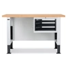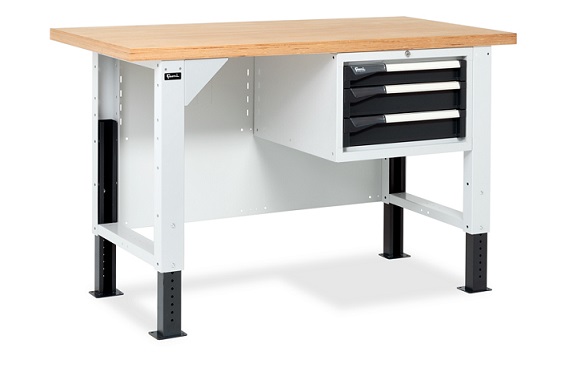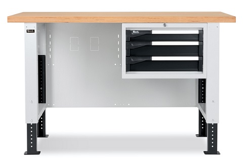 Banco Work Master BR 1505 in lamiera di acciaio verniciato. Completo di: n.1 cassettiera da 560x610x369H mm. a 3 cassetti (n.1 H75mm. - n.2 H100mm.). Piano in Multiplex spessore 40 mm. Gambe regolabili in altezza. Passo fori gambe 25 mm. FORNITO SMONTATO
