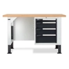 Banco Work Master BR 1506 in lamiera di acciaio verniciato. Completo di:n.1 cassettiera da 560x610x669H mm. a 4 cassetti (n.1 H75mm. - n.2 H150mm. - n.1 H200mm.)Piano in Multiplex spessore 40 mm.Gambe regolabili in altezza.Passo fori gambe 25 mm.FORNITO SMONTATO