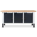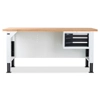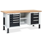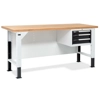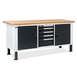 Banco Work Master BR 2005 in lamiera di acciaio verniciato. Completo di: n.1 cassettiera da 560x610x369H mm. a 3 cassetti (n.1 H75mm. - n.2 H100mm.) Piano in Multiplex spessore 40 mm. Gambe regolabili in altezza. Passo fori gambe 25 mm. FORNITO SMONTATO