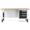 Banco Work Master BR 2006 in lamiera di acciaio verniciato. Completo di: n.1 cassettiera da 560x610x669H mm. a 4 cassetti (n.1 H75mm. - n.2 H150mm. - n.1 H200mm.) Piano in Multiplex spessore 40 mm. Gambe regolabili in altezza. Passo fori gambe 25 mm. FORNITO SMONTATO
