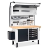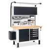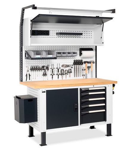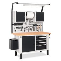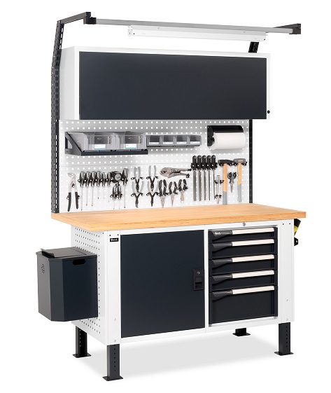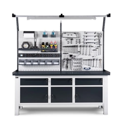BREVETTATO.Banco da lavoro porta attrezzi con numerose soluzioni per l'organizzazione di tutto il materiale per il lavoro: pareti forate laterali, armadi con porte e cassetti , parete forata con pensile vasistas. Completano la soluzione i ganci universali portautensili Unipok e gli accessori Iron Team. Quest'ultimi sono presenti sia nella versione Electric per disporre di una fonte di energia direttamente sul banco, che nella versione Light per illuminare l'area del piano di lavoro. Completo di:n.2 pannelli forati laterali n.1 cassettiera con 5 cassetti L 560 mm. Piano in Multiplex spessore 40 mm. n.2 ripiani superiori/inferiori per porta n.1 elemento con porta totale cerniera sinistra n.1 supporto semipiano intermedio aggiuntivo n.1 piano interno n.1 cestino capacità 30 lt.n.2 porta bombolette inclinato a 2 posti n.1 tasca portadocumenti A4 n.1 kit 2 montanti biasolati per banchi n.1 kit 2 pannelli forati/mensole con bordo fermacasse n.1 kit 2 supporti inclinati con binario base n.1 lampada IRON TEAM doppian.1 pensile vasistas WORK LOOK senza serratura n.1 kit staffe di fissaggio pensile vasistas WORK LOOK su montanti n.1 barra led n.1 mensola grande reversibile n.1 barra aggancio contenitori con 4 contenitori Picking Box mis.1 n.1 kit porta rotolo con carta Ø 130 mm. n.3 onfezioni da 30 ganci Unipok n.1 supporto multipresa a 2 scomparti n.1 multipresa Schuko a 2 scomparti n.1 supporto multipresa a 4 scomparti n.1 multipresa Schuko a 4 scomparti n.1 cavo di collegamento Wieland Schuko/FR n.1 kit 2 contenitori Picking Box misura 3A2 Gambe regolabili in altezza.