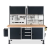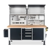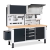 Completo di: n.2 pannelli laterali n.1 elemento da 560x610x669H mm. con porta H600mm., con cerniera sinistra. n.1 cassettiera da 560x610x669H mm. a 4 cassetti (n.1 H75mm. - n.2 H150mm. - n.1 H200mm.) n.1 elemento da 560x610x669H mm. con porta H600mm., con cerniera destra Piano in Multiplex spessore 40 mm. n.4 piani superiori/inferiori per porta L 560 mm. n.2 piani interni n.2 supporti semipiano intermedio aggiuntivo n.1 cestino, capacità 30 litri n.2 porta bombolette inclinato a 2 posti n.1 tasca portadocumenti A4 n.1 kit 3 montanti biasolati n.1 pannello forato ELECTRIC n.1 pannello/mensola con 1 bordo fermacassa n.1 multipresa Schuko a 4 scomparti n.1 magnetotermico differenziale n.2 multipresa Schuko a 2 scomparti n.1 cavo di collegamento Wieland Schuko/francese n.2 pensili vasistas WORK LOOK senza serratura n.2 kit staffe di fissaggio pensile vasistas WORK LOOK su montanti n.2 barre led n.5 supporti universali per utensili UNIPOK confezione da 30 pz. n.1 kit porta rotolo con carta Ø 240/300 mm. FORNITO SMONTATOUtensili ed attrezzatura non sono compresi nella composizione.