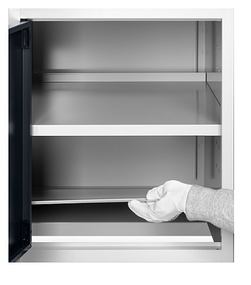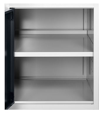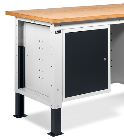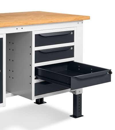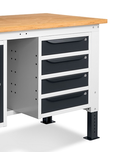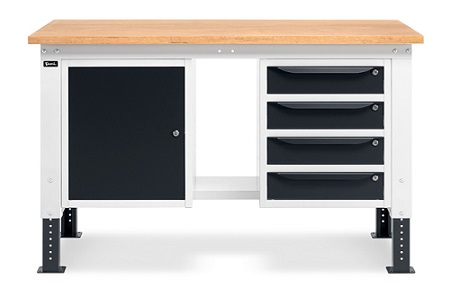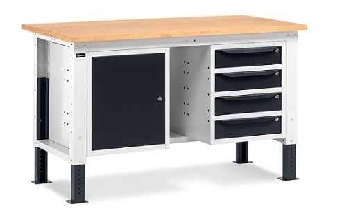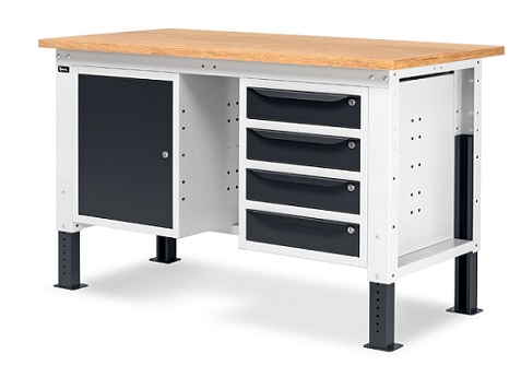 Banco Work Up 1505 in lamiera di acciaio verniciato. Completo di: n.1 elemento da 500x607x570H mm. con porta H490 mm., con cerniera sinistra n.1 semipiano n.1 cassettiera L 500mm. a 4 cassetti H105mm. Piano in Multiplex spessore 30 mm. Gambe regolabili in altezza. Passo fori gambe 25 mm. FORNITO SMONTATO Disponibile anche nella versione blu RAL5012