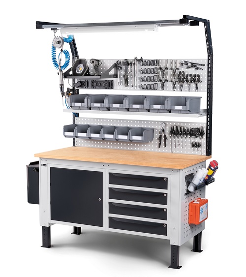 BREVETTATO. Questo banco da lavoro presenta numerose soluzioni per agevolare il lavoro dell'operatore: pannello porta attrezzi, dalle dimensioni compatte (150 cm.) e regolabile in altezza, pannelli forati arricchiti da ganci portautensili Unipok ed accessori Iron Team per la custodia di utensili ed attrezzatura, mentre le due multiprese forniscono una fonte di energia per la ricarica e l'uso dell'attrezzatura elettrica. Due armadi nella parte inferiore, uno con cassetti e l'altro con anta singola, offrono un ulteriore spazio per l'organizzazione del materiale. Per illuminare il piano di lavoro è stata installata una lampada doppia sui binari. Completo di: n.1 armadio con porta totale e ripiano regolabile L 629 mm. n.1 fondo di chiusura per armadio n.1 cassettiera con 4 cassetti L 629 mm.Piano in Multiplex spessore 30 mm. n.2 pannelli forati laterali n.1 cestino capacità 30 litri n.2 porta bombolette inclinati a 2 posti n.1 kit pronto soccorso n.1 kit 2 montanti biasolati per banchi n.1 kit 3 pannelli forati/mensole con 2 bordi fermacasse n.1 kit 2 supporti inclinati con binario base n.1 binario base in alluminio con attacchi n.1 lampada IRON TEAM doppia n.1 set aria compressa con bilanciatore portata 1-2Kg. e filtro n.2 barre aggancio contenitori con 3 contenitori Picking Box mis.2n.3 kit 2 contenitori Picking Box mis.3A2 n.1 supporto multipresa a 2 scomparti n.1 supporto multipresa a 4 scomparti n.1 multipresa Schuko 4 scomparti n.1 multipresa Schuko 2 scomparti n.1 cavo di collegamento Wieland Schuko/FR n.1 mensola grande reversibile n.3 confezioni da 30 ganci Unipok Gambe regolabili in altezza. FORNITO SMONTATO.Utensili ed attrezzatura non sono compresi nella composizione.