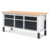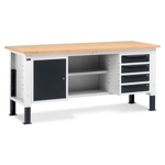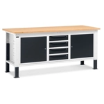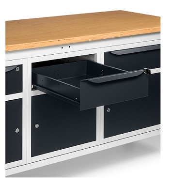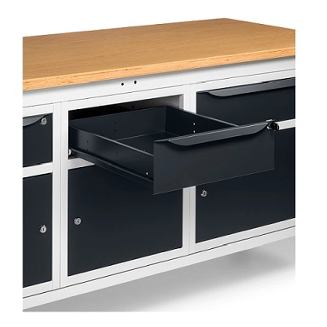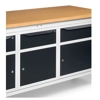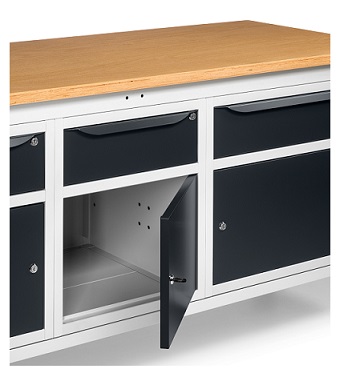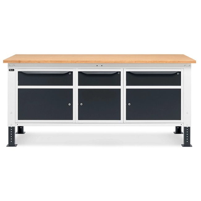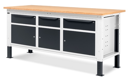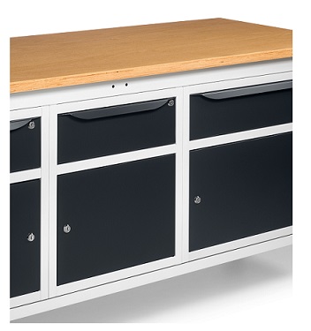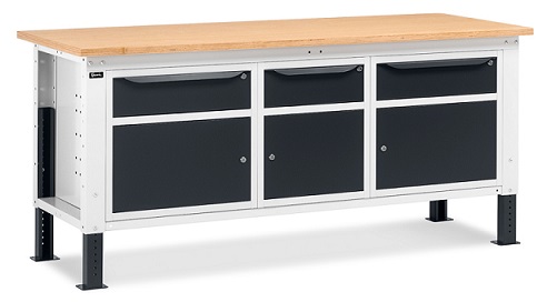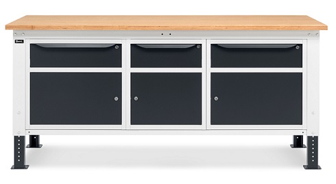 Banco Work Up 2011 in lamiera di acciaio verniciato. Completo di: n.1 elemento da 629x607x570H mm. con n.1 cassetto H150 mm. e n.1 porta H310 mm., con cerniera sinistran.1 elemento da 500x607x570H mm. con n.1 cassetto H150 mm. e n.1 porta H310mm., con cerniera sinistran.1 elemento da 629x607x570H mm. con n.1 cassetto H150 mm. e n.1 porta H310 mm., con cerniera destraPiano in Multiplex spessore 30 mm. Gambe regolabili in altezza. Passo fori gambe 25 mm. FORNITO SMONTATO Disponibile anche nella versione blu RAL5012
