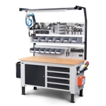 Completo di: n.2 armadi con porta totale e ripiano regolabile L 629 mm. n.1 cassettiera con 4 cassetti L 500 mm. Piano in Multiplex spessore 30 mm.n.2 pannelli foratin.1 semipiano non fessurato aggiuntivo n.1 kit 3 montanti biasolati per banchi n.2 kit 3 pannelli forati/mensole con 2 bordi fermacasse n.1 kit 3 supporti inclinati cpn 2 binari base n.1 set aria compressa con bilanciatore portata 1-2Kg. e filtro n.1 lampada IRON TEAM doppia n.1 cestino capacità 30 litri n.2 porta bombolette inclinati a 2 posti n.2 tasche porta documenti A4n.1 mensola grande reversibilen.1 supporto per interruttore magnetotermicon.1 supporto multipresa a 2 scompartin.1 supporto multipresa a 4 scompartin.1 magnetotermico differenzialen.1 multipresa Schuko 4 scompartin.1 multipresa Schuko 2 scompartin.1 cavo di collegamento Wieland Schuko/FRn.1 kit porta rotolo con carta diam.240/300 mm. n.2 kit 2 contenitori Picking Box mis.3A2 n.6 confezioni da 30 ganci UnipokGambe regolabili in altezza.