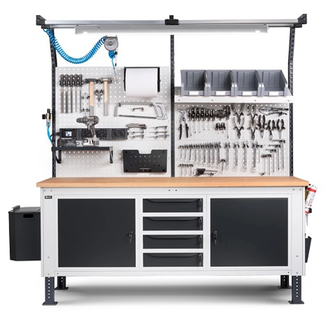 BREVETTATO. Banco da lavoro regolabile in altezza e completo di pannello portautensili, piano di lavoro in legno, cassetti per banco e accessori vari.Per avere a disposizione tutto il necessario, il banco è stato arricchito da ganci Unipok per l'organizzazione degli utensili, accessori Iron Team per la sistemazione dell'attrezzatura e componenti Iron Team Electric per fornire una fonte di energia per la ricarica di tutto il materiale per il tuo lavoro.Nel binario è stata aggiunta anche una lampada doppia per fornirti una fonte di luce nel caso in cui l'ambiente di lavoro sia poco luminoso.