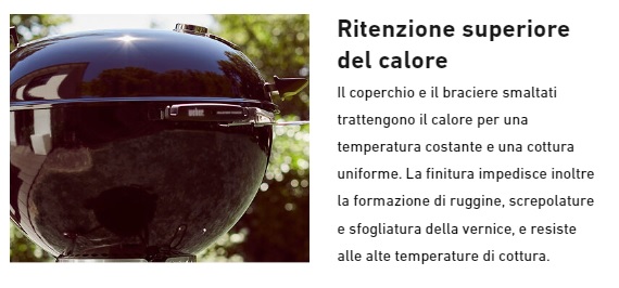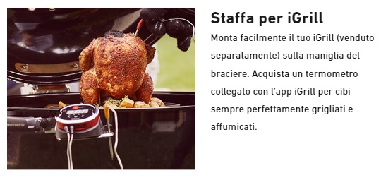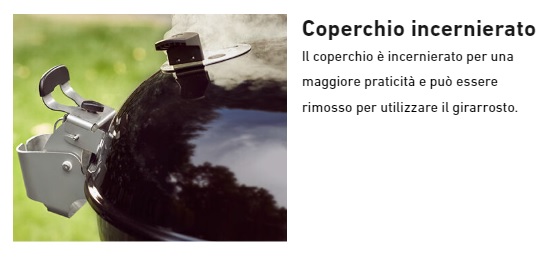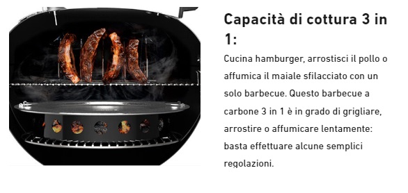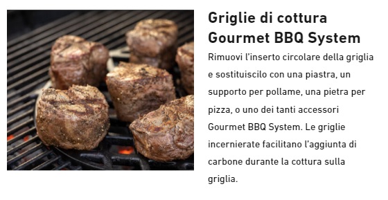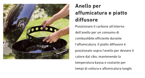 IL BARBECUE CON CODICE 17401053 CORRISPONDE ANCHE AL CODICE 17401004.**** VERRA' CONSEGNATO IL BARBCUE 17301053 + LA GRIGLIA ROSOLATURA 8834. ****Barbecue a carbone Weber Master-Touch GBS Premium SE E-5775 - 57 cm. - cod. 17401053. Il barbecue a carbone Master-Touch Premium 3 in 1 ti consente di affumicare, arrostire e grigliare qualsiasi cosa - dalle bistecche (griglia per rosolatura GBS inclusa) al pulled pork oppure dal pane ai dessert con il Gourmet BBQ System. Con nuove funzionalità come il comodo coperchio incernierato e l'anello per affumicatura/piatto diffusore per un consumo di combustibile efficiente, Master-Touch Premium è la risposta a tutto ciò che puoi chiedere ad un barbecue e molto di più. Caratteristiche Maniglia del braciere in nylon rinforzato con fibre di vetro. Braciere e coperchio in acciaio smaltato. Raccoglicenere in alluminio, ad alta capacità, rimovibile. Coperchio incernierato, per un'apertura agevole mentre si controlla il cibo. Sistema di pulizia One-Touch in acciaio inox con rivestimento in silicone, per un'agevole discesa della cenere nella vaschetta rimovibile. Clip a molla per fissaggio gambe. Maniglia Easy-Grip. Staffetta per il termometro iGrill, per tenerlo sempre a portata di mano. Anello contenitore per carbone e piatto diffusore per affumicare in modo facile e pratico. Maniglia per coperchio. Impostazione affumicatura. Capacità di cottura 3 in 1: griglia, arrostisci e affumica. Include griglia per rosolatura in ghisa, per aggiungere marcature perfette e gustose alle bistecche, etc. Valvola di areazione in alluminio, per assicurare un corretto flusso di aria.