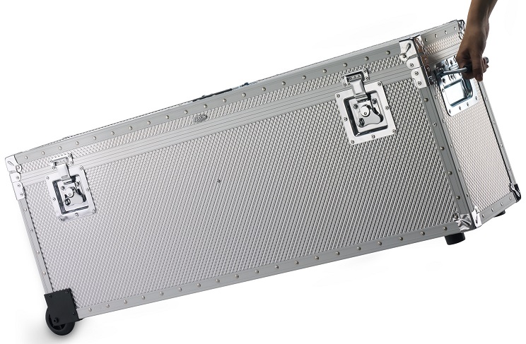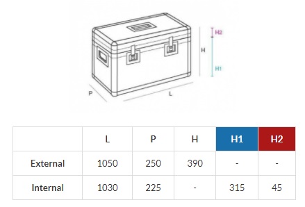 Baule GRINTA/105/R 1050X250X390 mm.Robustissimo BAULE trainabile in alluminio FramWL anodizzato argento satinato e bocciardato antigraffio. La particolare struttura in alluminio brevettata Fram e il supporto interno in fibra Vulcanizzata, materiale antiurto e indeformabile, rendono i bauli della linea GRINTA assolutamente resistenti a urti accidentali e senza limiti di portata pur mantenendo un peso contenuto.Adatto a spedizioni di prodotti e macchinari importanti e delicati, garantisce la massima stabilità e protezione al contenuto trasportato. Interno con tutte le pareti rivestite con espanso ad alta densità a cellule chiuse, spessore mm 10, e finitura antigraffio.Baule trolley con n. 2 ruote semiincassate in poliuretano trasparente con doppi cuscinetti. Tre maniglie a vaschetta incassata, due serrature a incasso con chiusura a farfalla lucchettabile e piedini di appoggio in gomma.La maniglia incassata con molla laterale è adatta anche per trainare il baule.