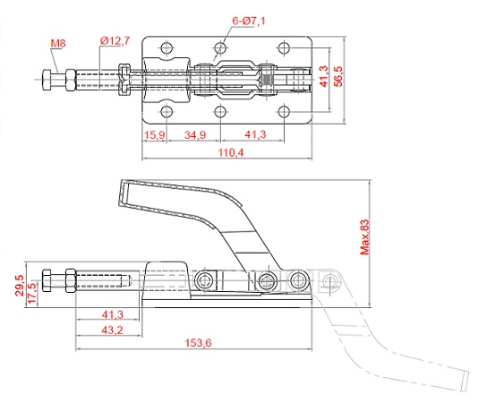 Bloccaggio a spinta - spintore 41,3 mm. - portata 320 Kg. - Articolo Clamptek CH-30607M.