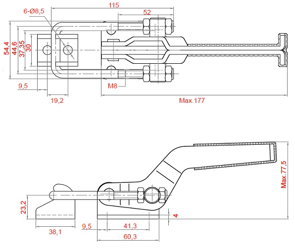 Bloccaggio a tirante - base piatta - versione orizzontale - portata 920 Kg. - Articolo Clamptek CH-40341-SS. - VERSIONE INOX.