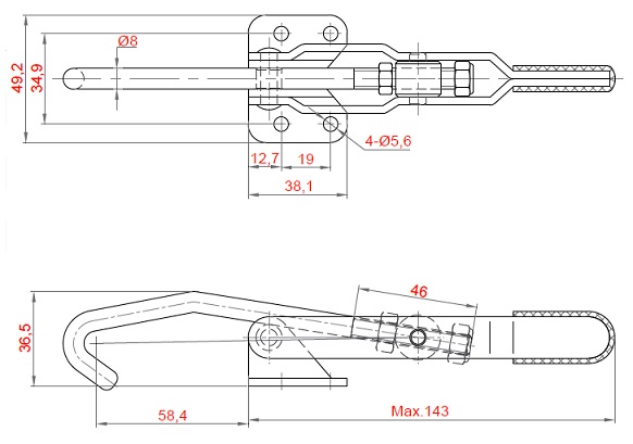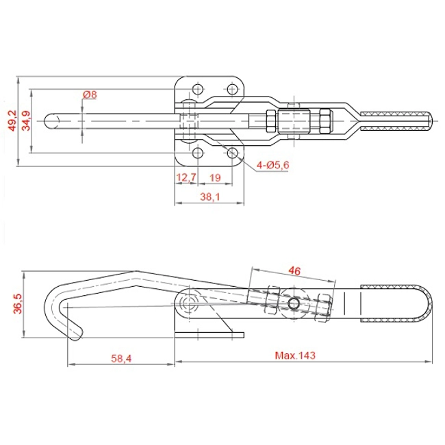 Bloccaggio ad uncino - base piatta - basso profilo - portata 170 Kg. - Articolo Clamptek CH-451.