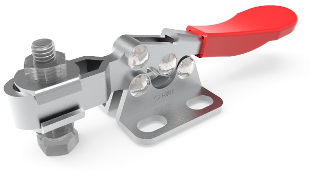 Bloccaggio orizzontale - base piatta - braccio regolabile - portata 30 Kg. - Articolo Clamptek CH-201. Sfruttando le caratteristiche geometriche e i vantaggi meccanici, Il meccanismo a leva, amplifica la bassa forza imputata dall’operatore in un’elevata capacità di serraggio.Per realizzare questo, è necessario posizionare il bloccaggio al di sopra del proprio asse principale. Viene così garantita un’ottima tenuta e impedita l’apertura durante il lavoro.Queste caratteristiche rendono i bloccaggi a leva adatti a numerose applicazioni specialmente in operazioni ripetitive.L'intera gamma presenta un design della struttura e un'impugnatura ergonomica, che permettono un'elevata funzionalità.