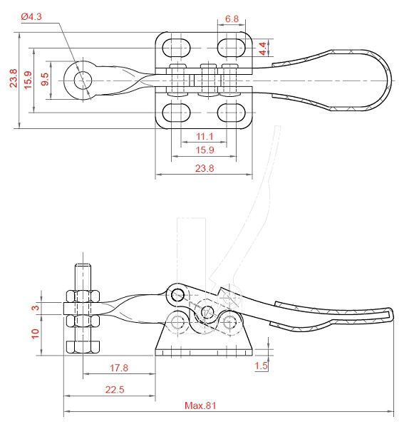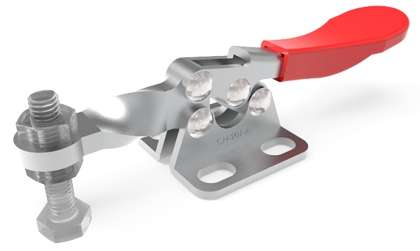 Bloccaggio orizzontale - base piatta - braccio fisso - portata 30 Kg. - Articolo Clamptek CH-201-A. Sfruttando le caratteristiche geometriche e i vantaggi meccanici, Il meccanismo a leva, amplifica la bassa forza imputata dall’operatore in un’elevata capacità di serraggio.Per realizzare questo, è necessario posizionare il bloccaggio al di sopra del proprio asse principale. Viene così garantita un’ottima tenuta e impedita l’apertura durante il lavoro.Queste caratteristiche rendono i bloccaggi a leva adatti a numerose applicazioni specialmente in operazioni ripetitive.L'intera gamma presenta un design della struttura e un'impugnatura ergonomica, che permettono un'elevata funzionalità.