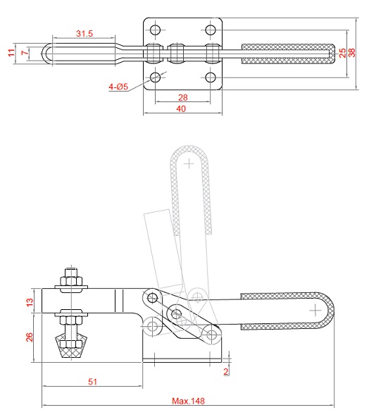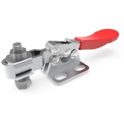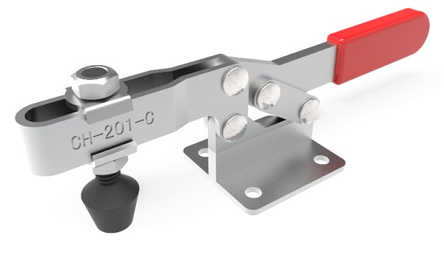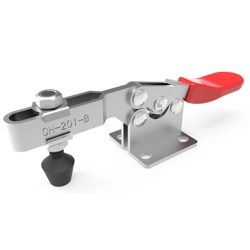 Bloccaggio orizzontale - base piatta - braccio regolabile - portata 100 Kg. - Articolo Clamptek CH-201-C. Sfruttando le caratteristiche geometriche e i vantaggi meccanici, Il meccanismo a leva, amplifica la bassa forza imputata dall’operatore in un’elevata capacità di serraggio.Per realizzare questo, è necessario posizionare il bloccaggio al di sopra del proprio asse principale. Viene così garantita un’ottima tenuta e impedita l’apertura durante il lavoro.Queste caratteristiche rendono i bloccaggi a leva adatti a numerose applicazioni specialmente in operazioni ripetitive.L'intera gamma presenta un design della struttura e un'impugnatura ergonomica, che permettono un'elevata funzionalità.